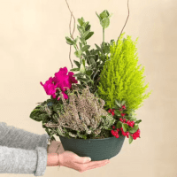 cette imposante coupe de plantes vertes (dont conifère) et fleuries dans les teintes roses et blanches est conçue pour durer en extérieur, quelle que soit la saison.